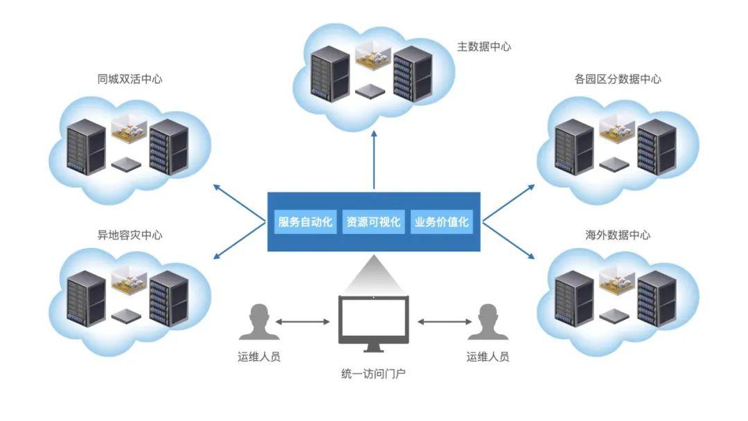 云管理软件统一管理,实现物理分散(多个数据中心)与逻辑统一(运维与运营统一);